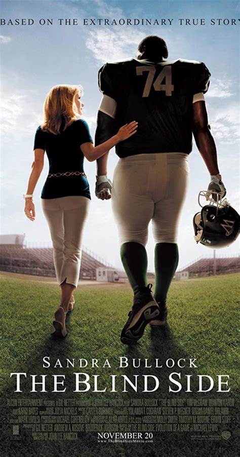 A movie I encourage you to watch is the picture I posted up top, it is called “The Blind Side” it is an inspirational piece about a well, successful living lady with a husband and kids, find this large homeless teen that has been out of high school for some time, and she takes him in as her own to help him get back on his feet. With her care and providing need for him they eventually realize he need to be on someone football team with his size, and he joins the football team for the high school and become a well taught student and football player.